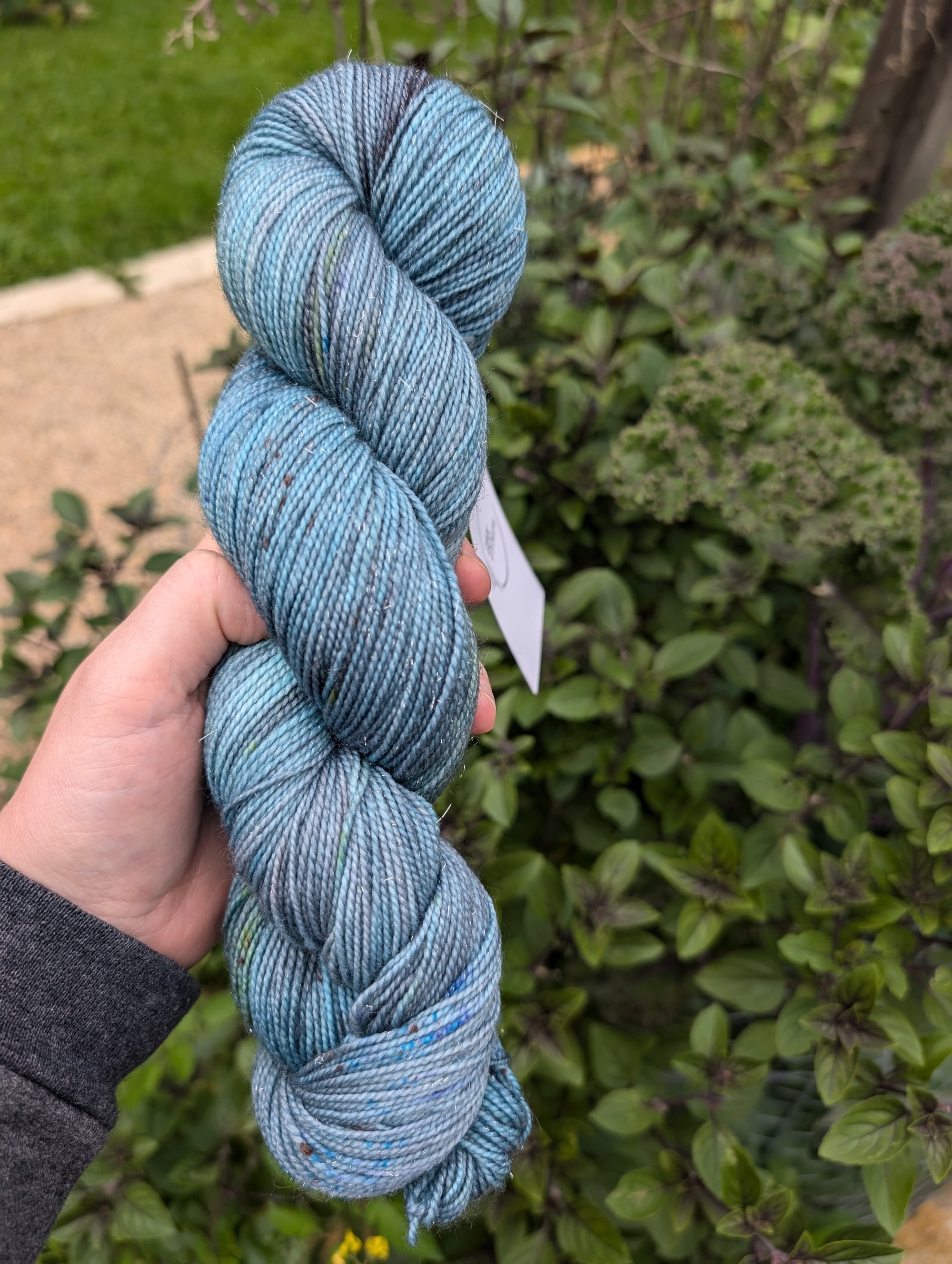I can't get the sparkle across in a photo, but this colorway sparkles like crazy! It has various shades of blue with few green and brown elements.